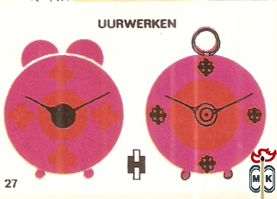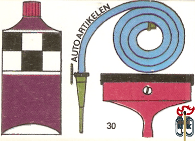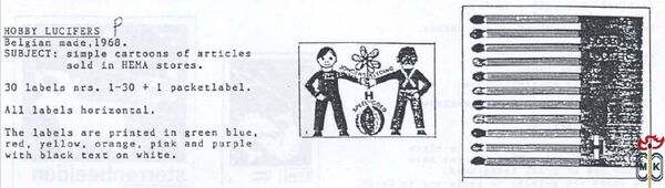 HOBBY LUCIFERS Belgian made, 1968 Subject: simple cartoons of articles sold in HEMA stores. 30 labels nrs. 1-30 + 1 packetlabel. All labels horizontal. The labels are printed in green blue, red, yellow, orange, pink and purple with black text on white.