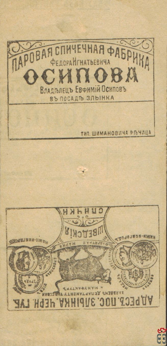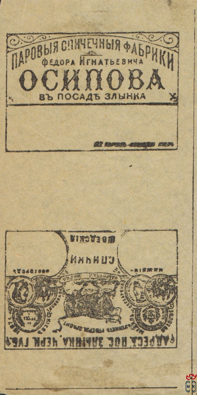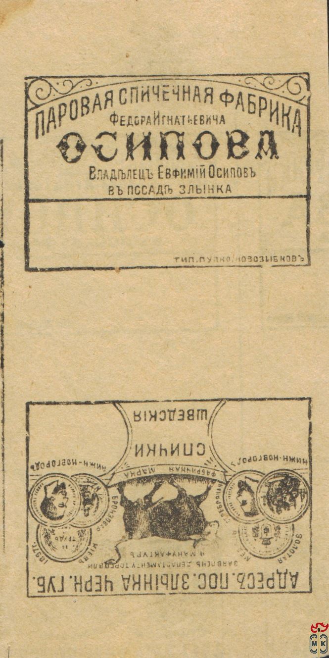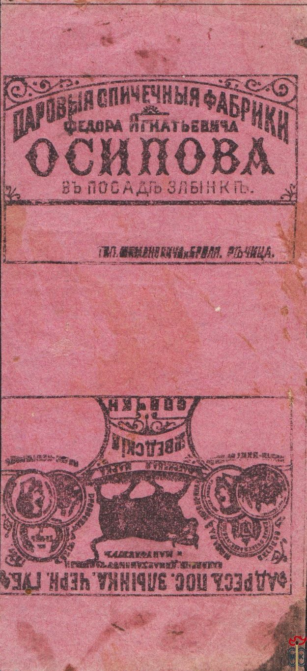 Основателем фабрики в Черниговской губ., в пос. Злынка в 1863 года считается Осипов Федор Игнатьевич. Работа была широко поставлена, вскоре