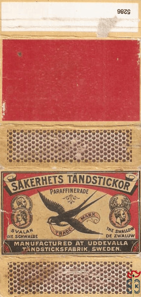 Sakerhets Tandstickor paraffinerade slavan die schwalbe the swalluw manufactured at uddevalla sticksfabrik. Sweden