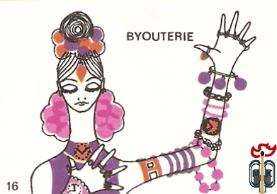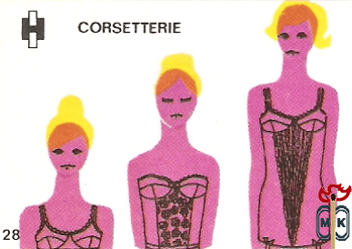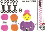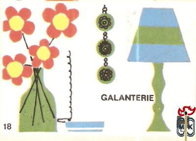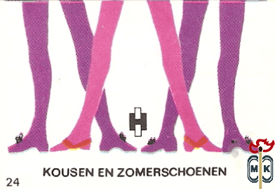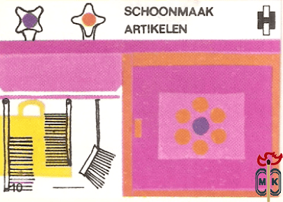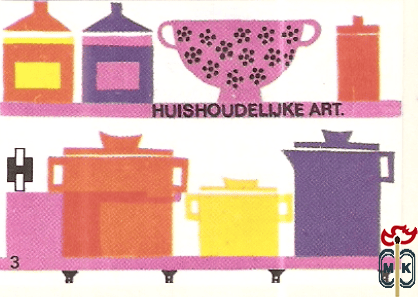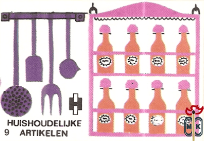 HOBBY LUCIFERS Belgian made, 1968 Subject: simple cartoons of articles sold in HEMA stores. 30 labels nrs. 1-30 + 1 packetlabel. All labels horizontal. The labels are printed in green blue, red, yellow, orange, pink and purple with black text on white.