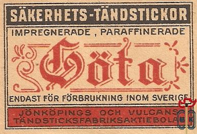 Gota sakerhets-tandstickor impregnerade, paraffinerade endast for forbrukning inom Sverige jonkopings och vulcans tan...